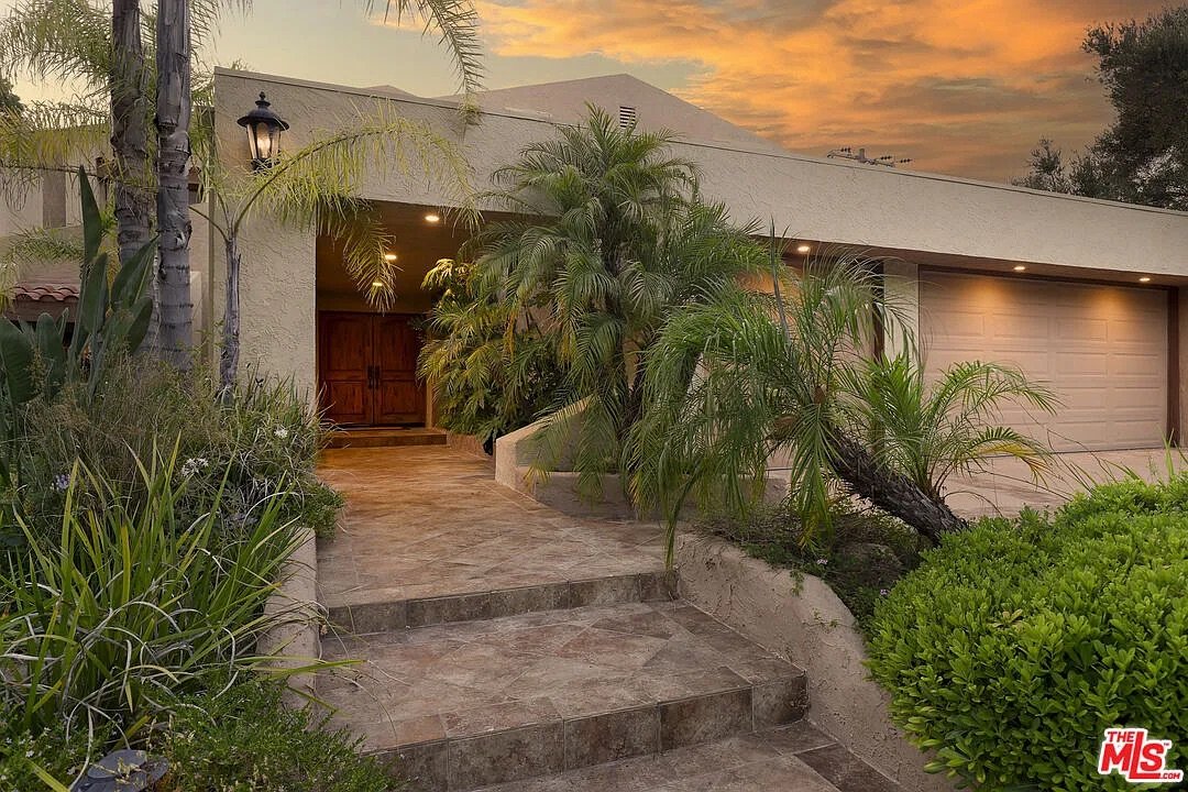 Two people, a woman and a man, walking down the stairs outside a house with a garage door, surrounded by plants and trees.